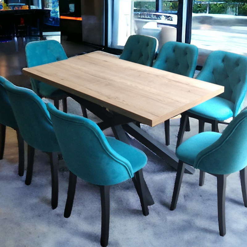Zestaw złożony z: Stół Pająk 1 w rozmiarze 160cm na 90cm, z dwiema wkładkami o długościach 40 cm, które umożliwiają wydłużenie stołu do 240cm. Nogi stołu wykonane są ze stali. Sześć sztuk krzeseł Krystian 2. Konfigurator umożliwia stworzenie 10800 unikalnych wariantów kolorystycznych danego kompletu. Czas realizacji 7-14 dni.