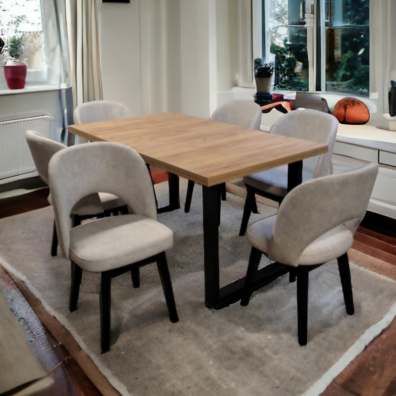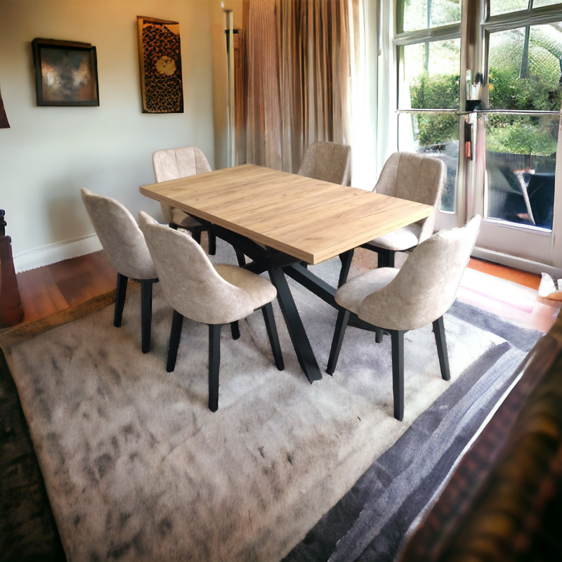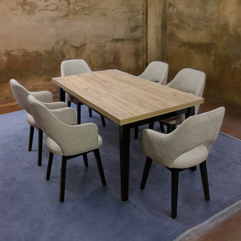 Zestaw złożony z: Stół Pająk 1 w rozmiarze 160cm na 90cm, z dwiema wkładkami o długościach 40 cm, które umożliwiają wydłużenie stołu do 240cm. Nogi stołu wykonane są ze stali. Sześć sztuk krzeseł Fiona 3. Konfigurator umożliwia stworzenie 10800 unikalnych wariantów kolorystycznych danego kompletu. Czas realizacji 7-14 dni.