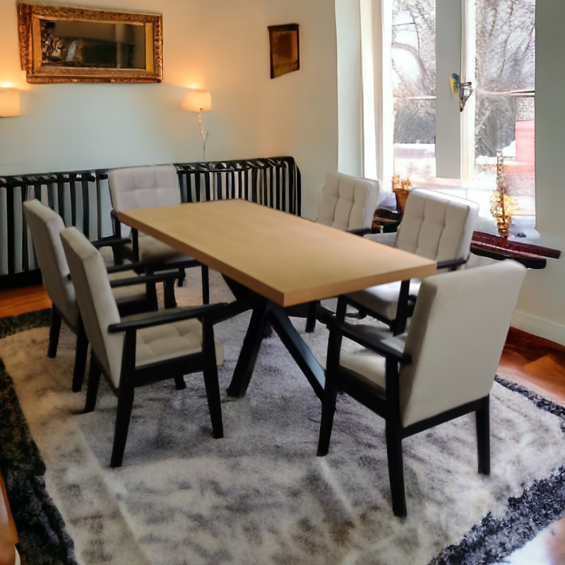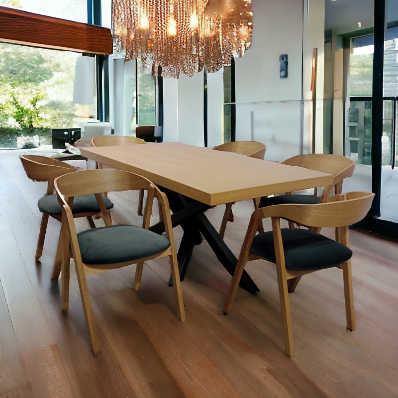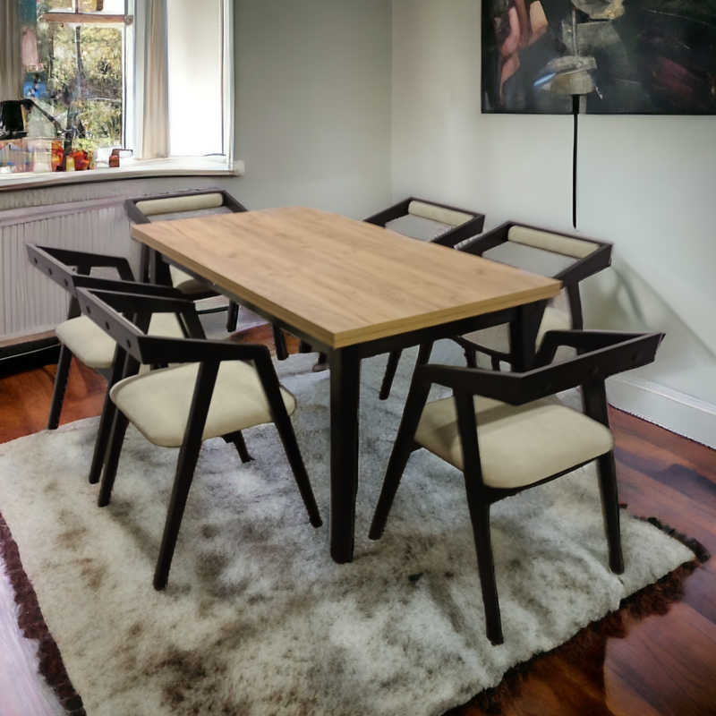 Zestaw złożony z: Stół Pająk 1 w rozmiarze 160cm na 90cm, z dwiema wkładkami o długościach 40 cm, które umożliwiają wydłużenie stołu do 240cm. Nogi stołu wykonane są ze stali. Sześć sztuk krzeseł Fotelik 13(dębowy). Konfigurator umożliwia stworzenie 10800 unikalnych wariantów kolorystycznych danego kompletu. Czas realizacji 7-14 dni.