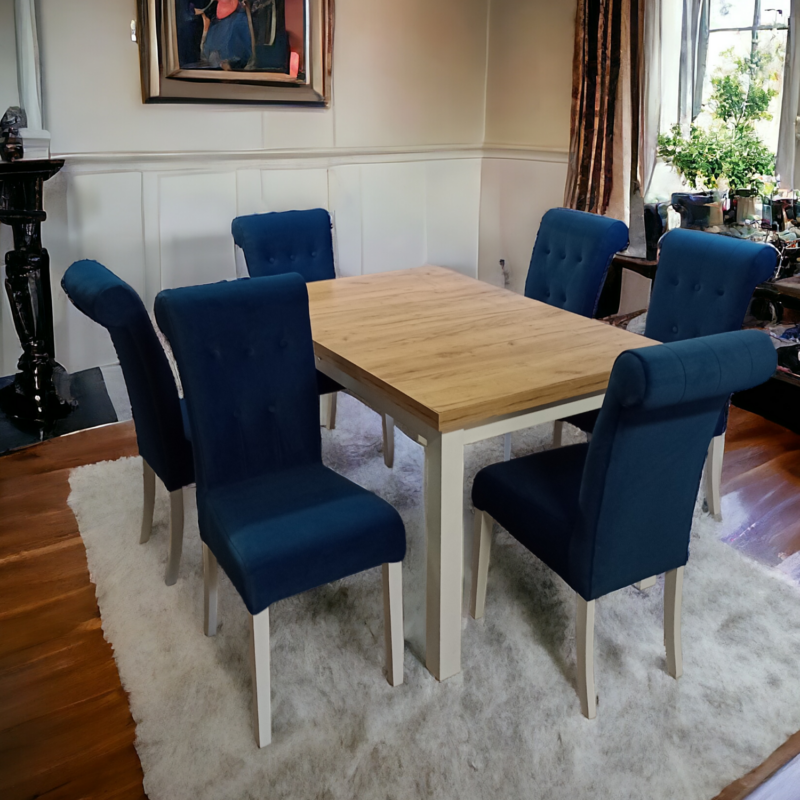 Zestaw złożony z: Stół Basia w rozmiarze 140cm na 80cm, z wkładką o długości 60 cm, która umożliwia wydłużenie stołu do 200cm. Sześć sztuk krzeseł Loft 3. Konfigurator umożliwia stworzenie 16200 unikalnych wariantów kolorystycznych danego kompletu. Czas realizacji 7-14 dni.