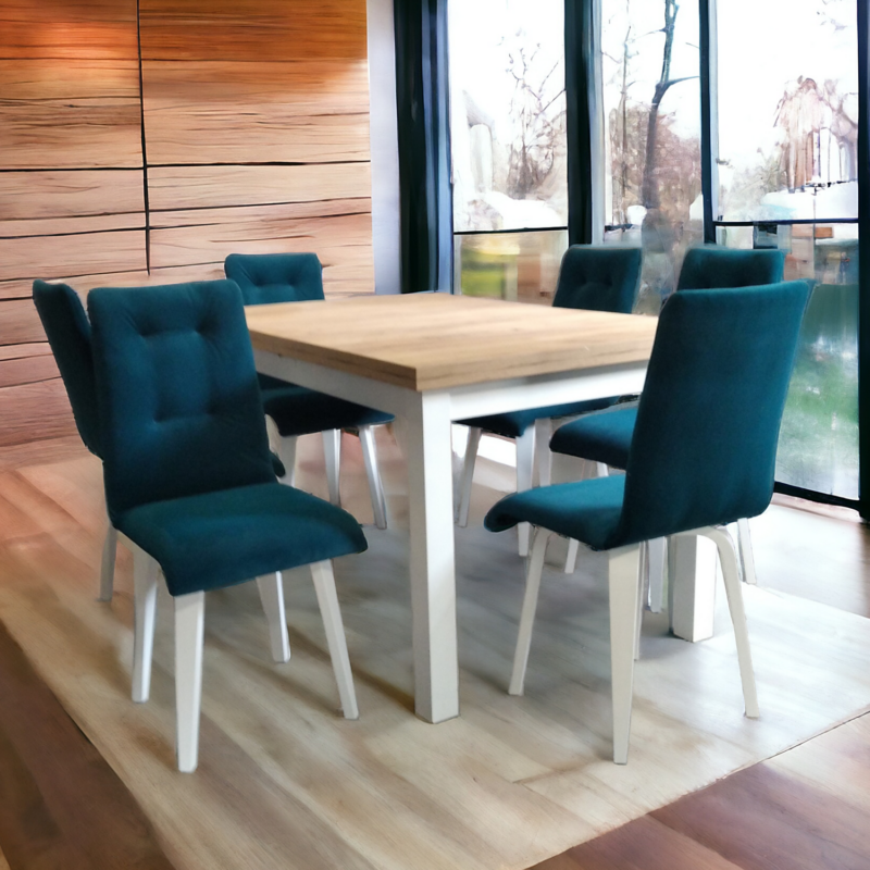 Zestaw złożony z: Stół Basia w rozmiarze 140cm na 80cm, z wkładką o długości 60 cm, która umożliwia wydłużenie stołu do 200cm. Sześć sztuk krzeseł Fotelik 12. Konfigurator umożliwia stworzenie 16200 unikalnych wariantów kolorystycznych danego kompletu. Czas realizacji 7-14 dni.