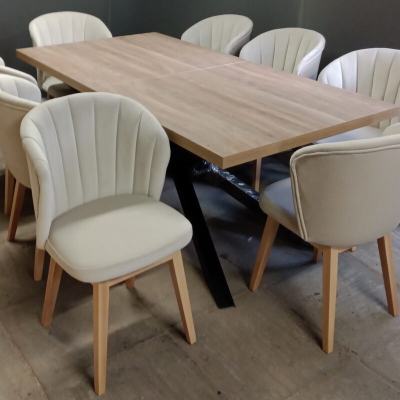 Zestaw złożony z: Stół Pająk 1 w rozmiarze 160cm na 90cm, z dwiema wkładkami o długościach 40 cm, które umożliwiają wydłużenie stołu do 240cm. Nogi stołu wykonane są ze stali. Osiem sztuk krzeseł Krystian 3. Konfigurator umożliwia stworzenie 10800 unikalnych wariantów kolorystycznych danego kompletu. Czas realizacji 7-14 dni.
