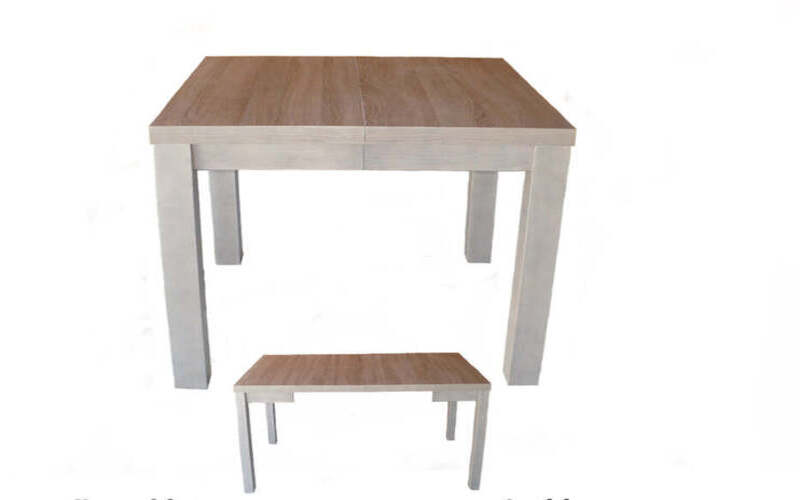 Stół w rozmiarze 90cm na 90cm, z trzema wkładkami o długościach 50 cm, które umożliwiają wydłużenie stołu do 240cm. Czas realizacji 7-14 dni.