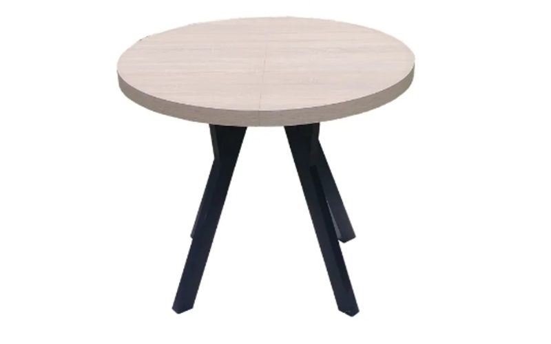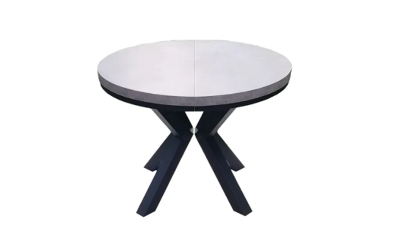 Stół o średnicy 100cm, z dwiema wkładkami o długościach 50 cm, które umożliwiają wydłużenie stołu do 200cm. Nogi wykonane są ze stali. Czas realizacji 7-14 dni.